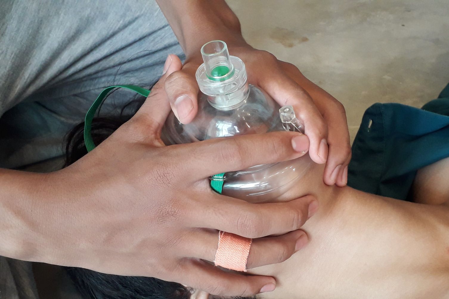 - Give 2 breaths into the mask 1 second each watching for visible chest rise. Resume chest compressions in less than 10 seconds.