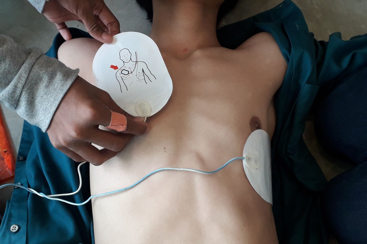 - Attach AED pads to the patient’s bare chest. Attach the pads’ connecting cables to the AED (some AED cables are preconnected).