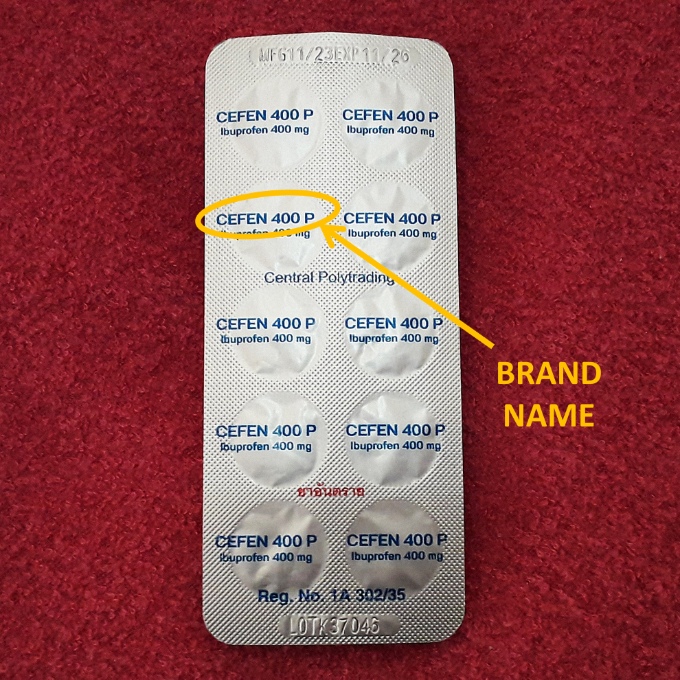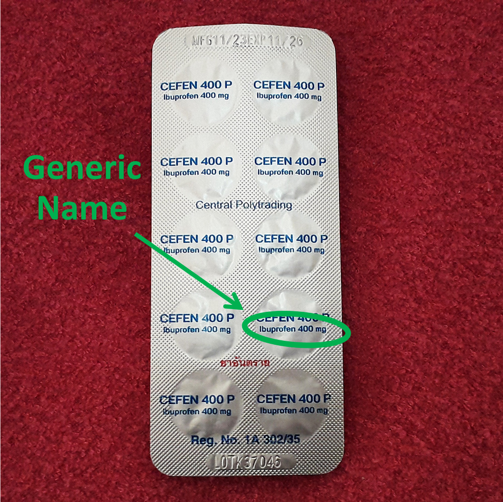 For Examples, Advil® (brand name), Ibuprofen (generic name), isobutylphenylpropionic acid (chemical name). Check the dosage, is it 81 mg aspirin or 325 mg?