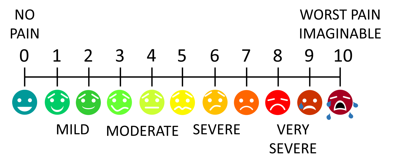 - Severity or Number – “On a scale of 0 to 10, how would you rate your pain?” We typically say 0-10 with 0 being no pain at all, and 10 being the worst pain ever felt. Sometimes a chart shows faces going from smiley to frowny face, illustrating the scale. If the patient’s problem is not pain related, replace the word ‘pain’ with words describing the patient’s problem when asking this question. “You are feeling very dizzy. On a scale of 0 to 10, how would you rate your dizziness?”