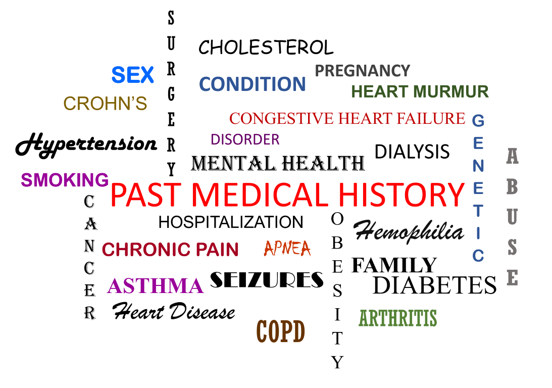 We try not to be too judgmental of the patient as we ask about drugs. We want to know about all drugs, to include illegal drugs, herbal supplements, and special magical forest medicine. It is about knowing what is happening to the patient so we can help the patient. Not blaming the patient. - Pertinent Past Medical History or Past Medical Problems – “What major medical conditions do you have?” We can give examples when we ask this question such as; diabetes, congestive heart failure (CHF), chronic disease, chronic obstructive pulmonary disease (COPD).