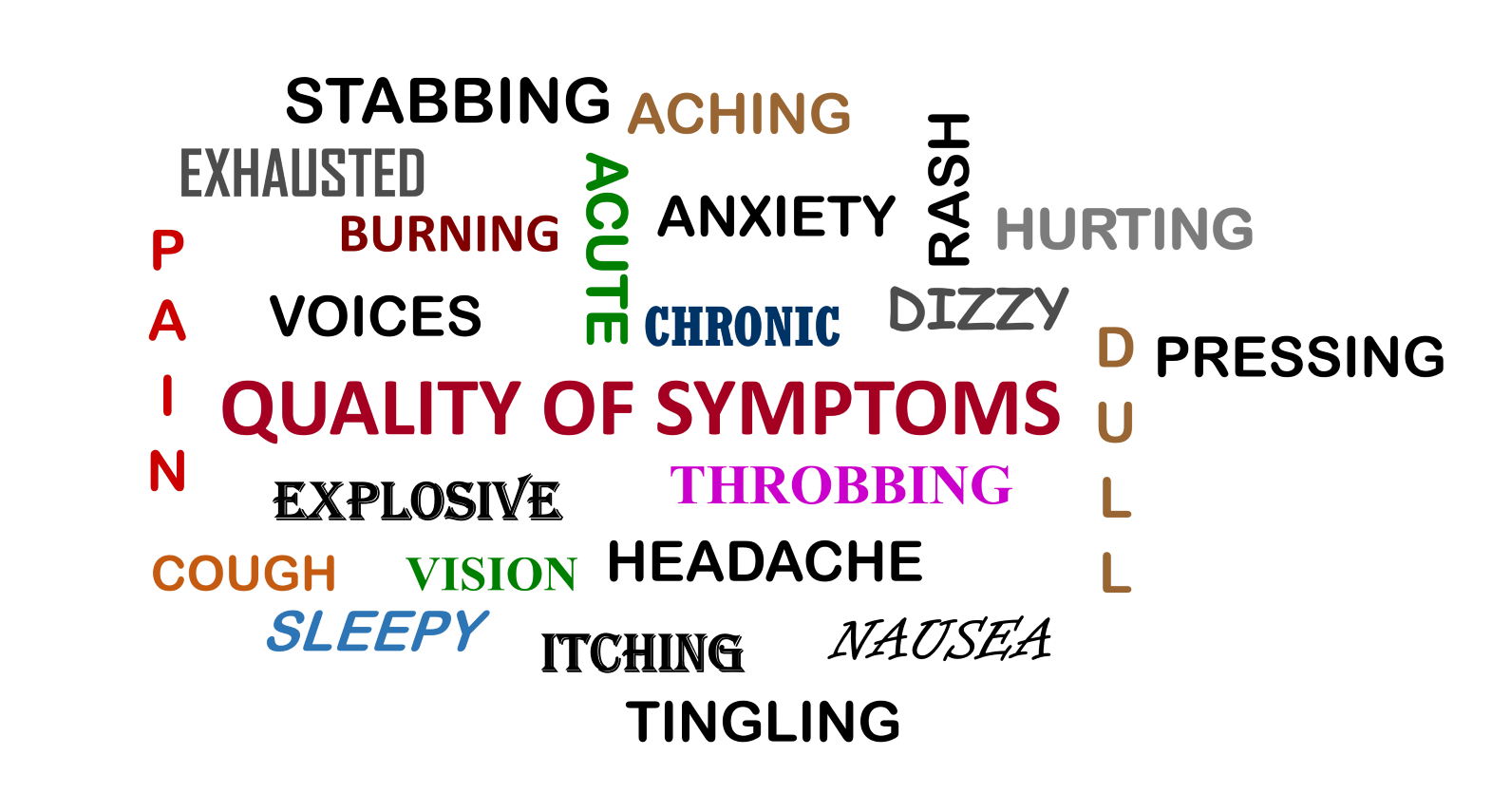 - Quality or How – “How would you describe your pain?” Usually, we need to help prompt the patient with some examples; sharp pain, stabbing, aching, tingling. Imagine letting the patient tell us a bit of what they are experiencing.