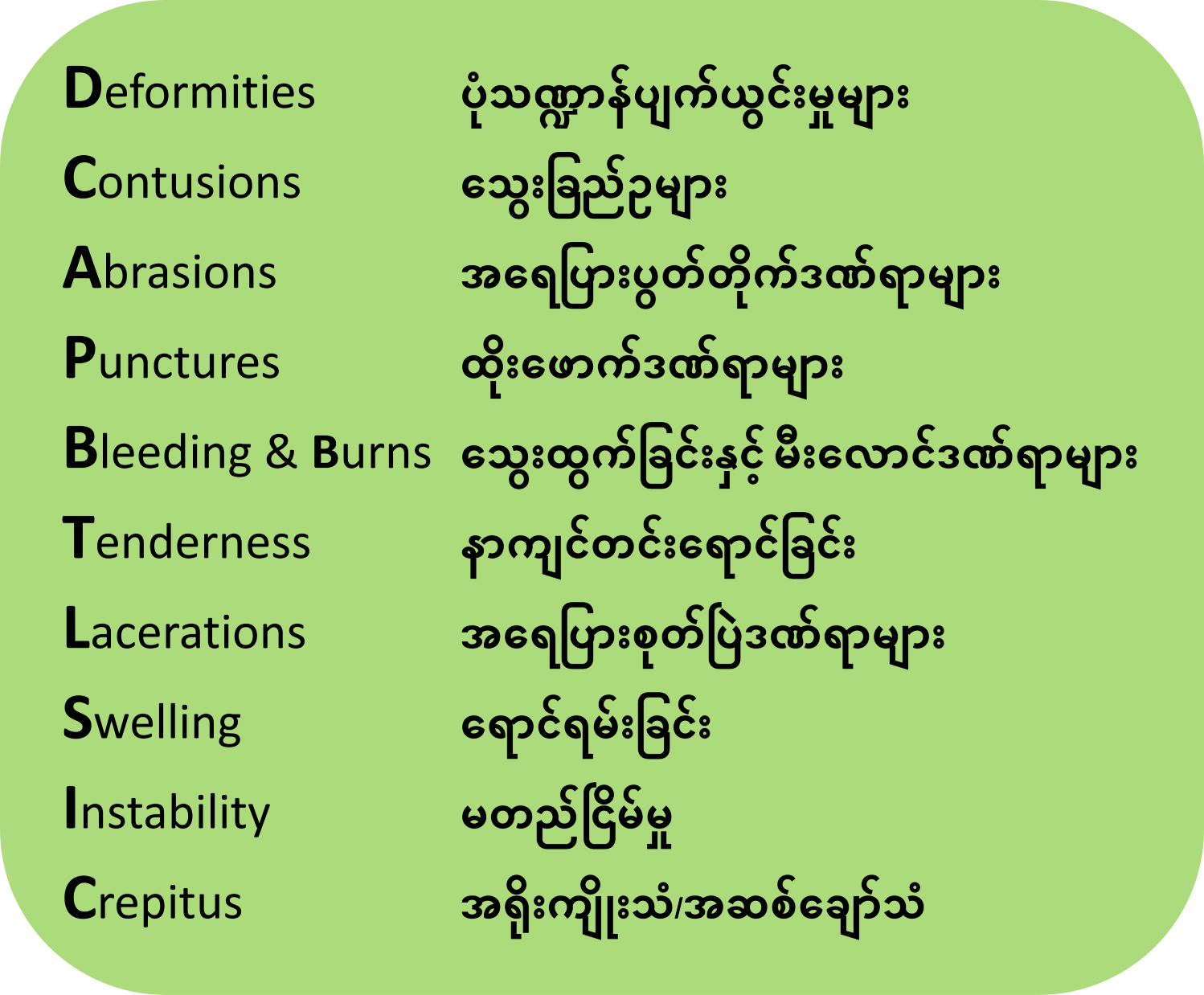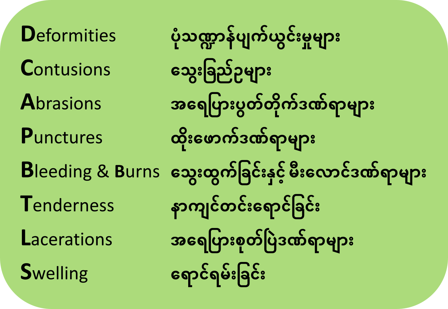 A - Abrasions (အရေပြားပွတ်တိုက်ဒဏ်ရာများ) - လူနာတွင် အရေပြားတွန့်ခြင်း (သို့) တွန့်ပြန့်ဒဏ်ရာများ ရှိပါသလား။ ပြည်တည်နာများ မဖြစ်စေရန် ဤဒဏ်ရာများကို သန့်စင်ပေးရန် မမေ့ပါနှင့်။