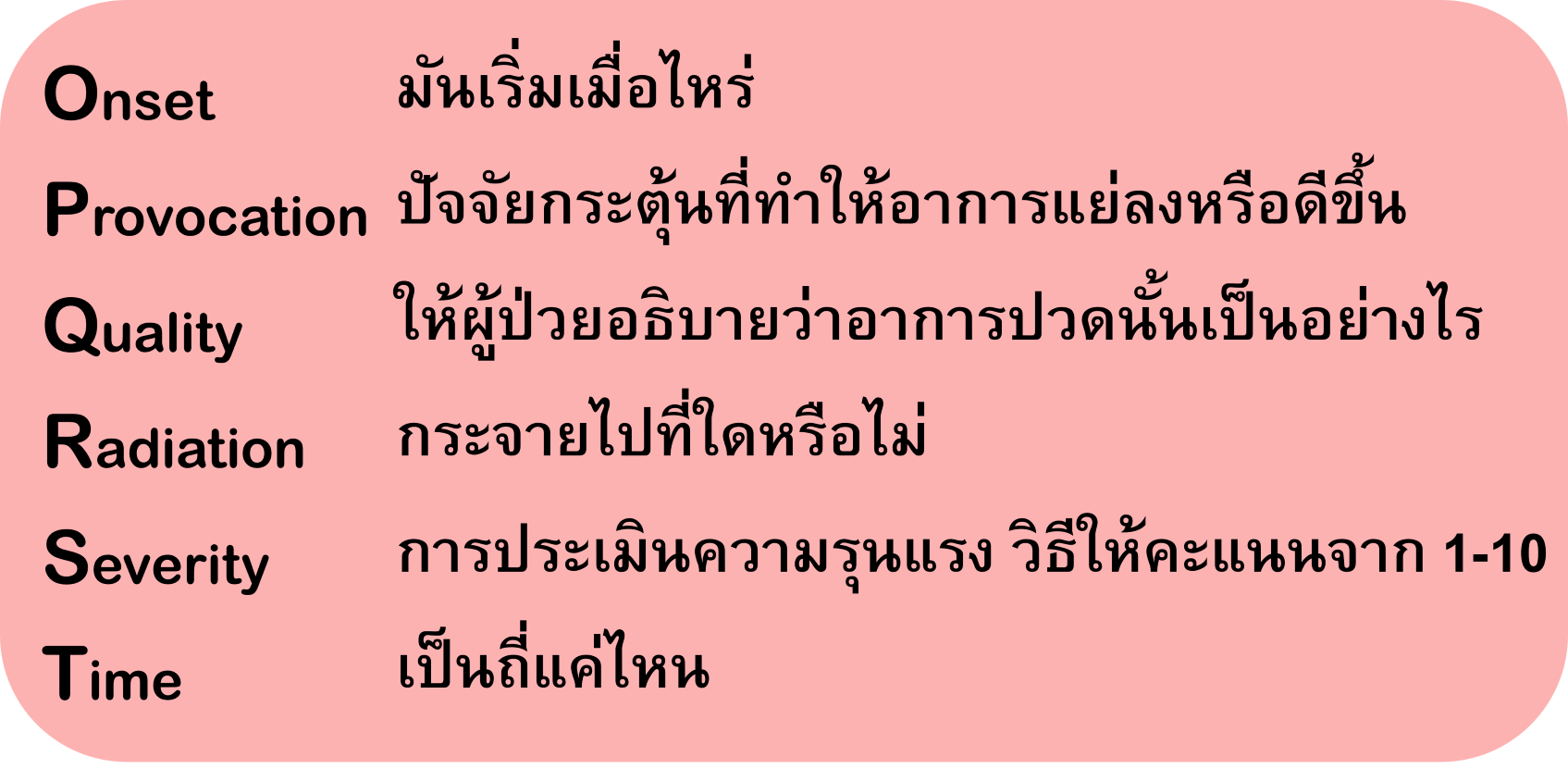 - Provocation อะไร หรือปัจจัยกระตุ้นที่ทำให้อาการแย่ลงหรือดีขึ้น – “อะไรทำให้รู้สึกแย่ลง” มักจะรวม “อะไรทำให้รู้สึกดีขึ้น” เข้าไปด้วย ซึ่งจะช่วยอธิบายกิจกรรมบางอย่างที่เกี่ยวข้องกับปัญหาได้