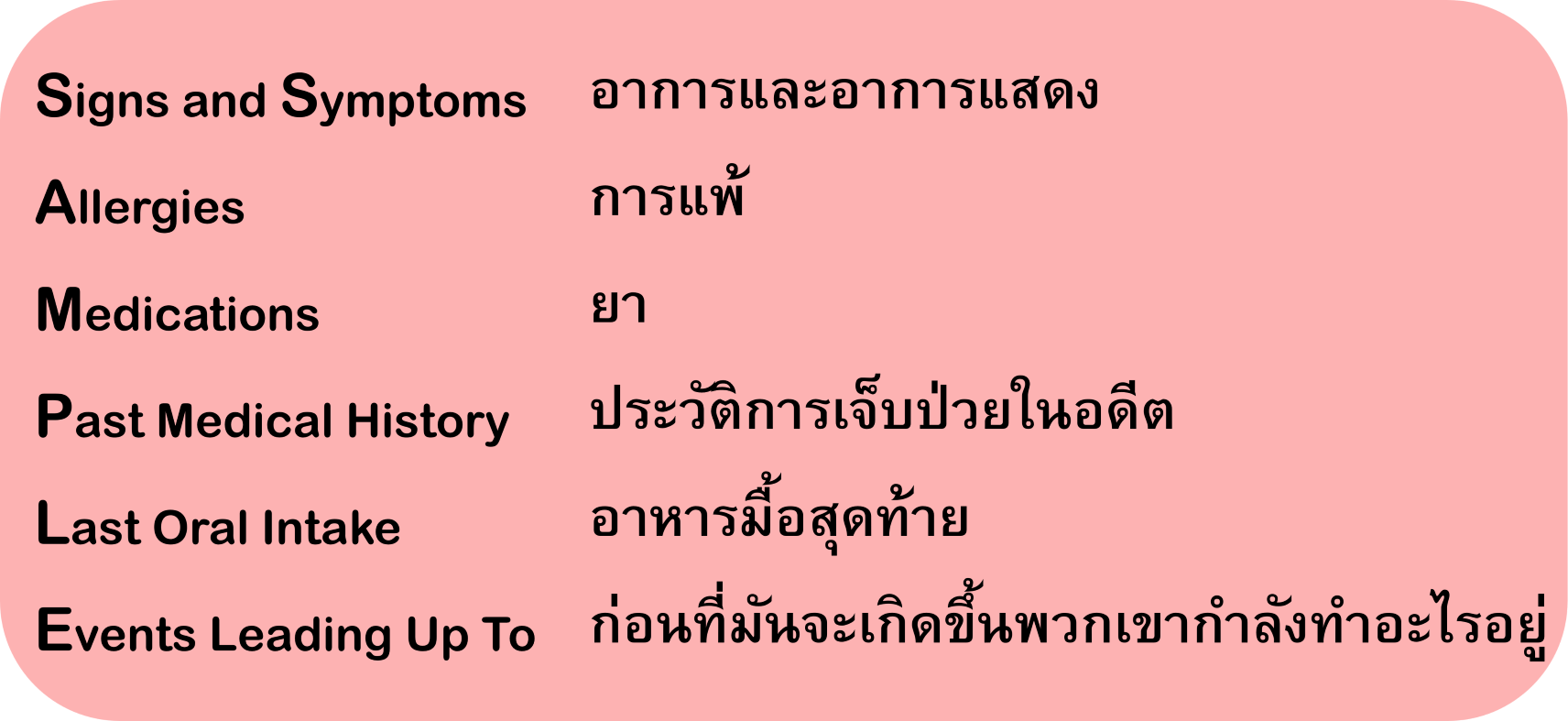 - Last Oral Intake อาหารมื้อล่าสุด – “วันนี้คุณกินอะไรไปบ้าง” หากผู้ป่วยบอกว่ากินคุกกี้ถั่วหลังจากตอบว่าแพ้ถั่ว เราก็อาจรู้ว่าอะไรทำให้พวกเขาป่วย การถามเกี่ยวกับหัวข้อนี้มักต้องชี้แจงให้ชัดเจน เช่น ถามว่ากินคุกกี้เมื่อใด หรือปัญหาเริ่มเกิดขึ้นก่อนหรือหลังกินคุกกี้ถั่ว