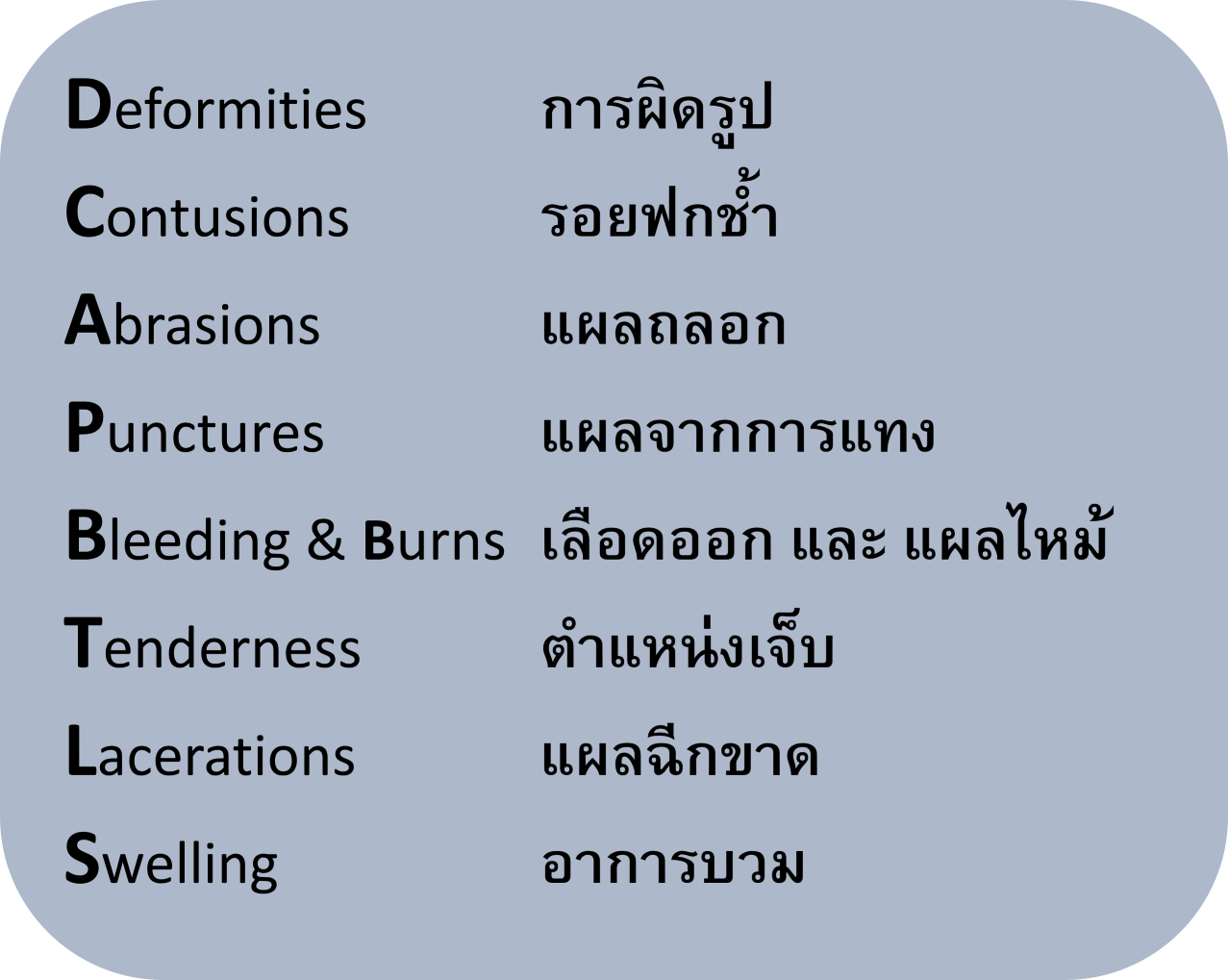 ที่จริงเราไม่ต้องจำทุกคำขนาดนั้น เพราะเราตรวจดูได้ว่าผู้ป่วยมีปัญหาอะไร จุดไหน การดูแลผู้ป่วยหรือผู้บาดเจ็บอย่างเหมาะสมมีความสำคัญกว่าการรู้จักคำศัพท์พวกนี้