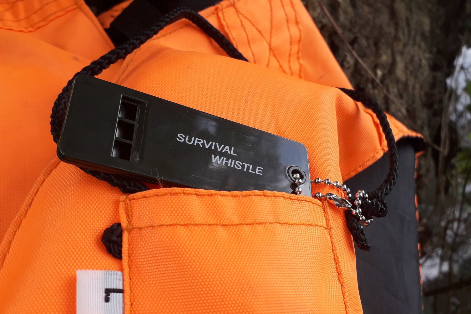 Knife มีดเล็ก – Knives cut entanglement hazards like ropes, fishing line, nets, and vines. This should be a small sheathed knife with a short string securing it to the life vest with serrations for quickly cutting. A small knife is safer for water work than a large knife that catches on things.