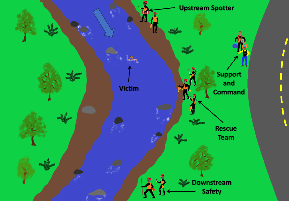 Water is dynamic and in a water emergency, we should first spread our rescuers out to account for a changing scene. For the family or friends immediately at the scene when it happens, they most likely will be right near the victim(s) and possibly start attempting to rescue the victim(s). It is suggested, one of the on-scene family and friends step up as the leader and identify the need to spread people out in rescue teams. The commonly way of organizing river teams is into upstream spotter team, rescue team, and downstream safety team. Emergency responders, will approach the scene from the outside and often send people upstream first to stabilize the situation. The arriving emergency unit leader and the onsite leader should attempt to link up and share information about the situation (transfer of command).